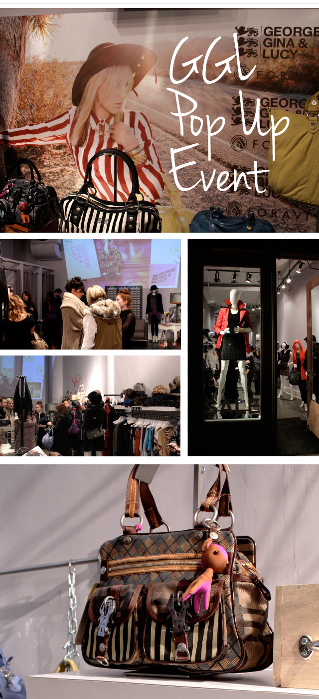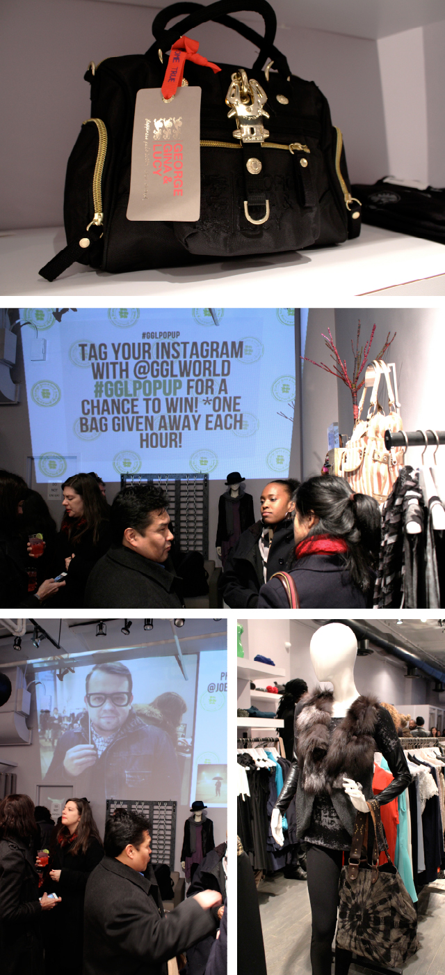 Last week I was invited to a pop up event for George, Gina & Lucy. GGL is a German handbag company that specializes in making fashionable, functional, and edgy handbags in a variety of materials and finishes. From nylon, to canvas, to leather, to a shiny pvc like material they call “Lacquer” there is something for all tastes. Their bags are sophisticated, girly, chic, trendy and above all fashion forward. They do not specialize in one look or even one market. From teenagers to the heads of corporations – there is a handbag for everyone. And many celebrities have been spotted with a GGL bag on their arms. January Jones, Nina Dobrev, Sophia Vergara and Kristen Bell are just a handful of the well known celebs that have been spotted out and about donning GGL. Even Channing Tatum was spotted with a GGL bag, and this is because they also make bags for men and children in addition to women.