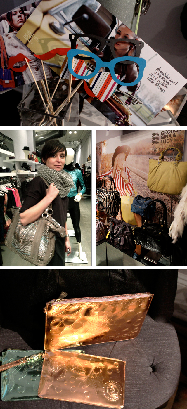 Of course I wanted to know what all the fuss was about so I was uber excited to attend the pop up event last Monday. It was held at Foravi, a boutique in Soho which I am ashamed to admit I had not been to before, but I will definitely be back! The clothes are gorge! They had a wonderful DJ who played one of my favorite songs the Yeah, Yeah Yeah’s “Heads Are Gonna Roll” and there was wine, cocktails and horderves. In addition they gave away three hand bags! Unfortunately I was not one of the lucky winners, but I was fortunate enough to get to chat with the Director of International sales Ines Mesin. She gave me a sneak peak at bag that is going to be rolled out for the fall collection – and she even let me snap a picture of it! I love it, it has a metallic like finish, a wonderful shape, and it is BIG. I like big bags with lots of compartments. This is what I love about GGL bags, they are not just fashionable but also functional. Many of the bags are designed with multiple compartments in addition to the main body of the bag, so there is a place for everything. This is something I ALWAYS look for in a handbag. It was a fun, informative and chic evening. I am so glad I went, and stay tuned for the next event I attend!