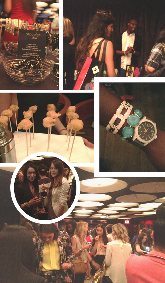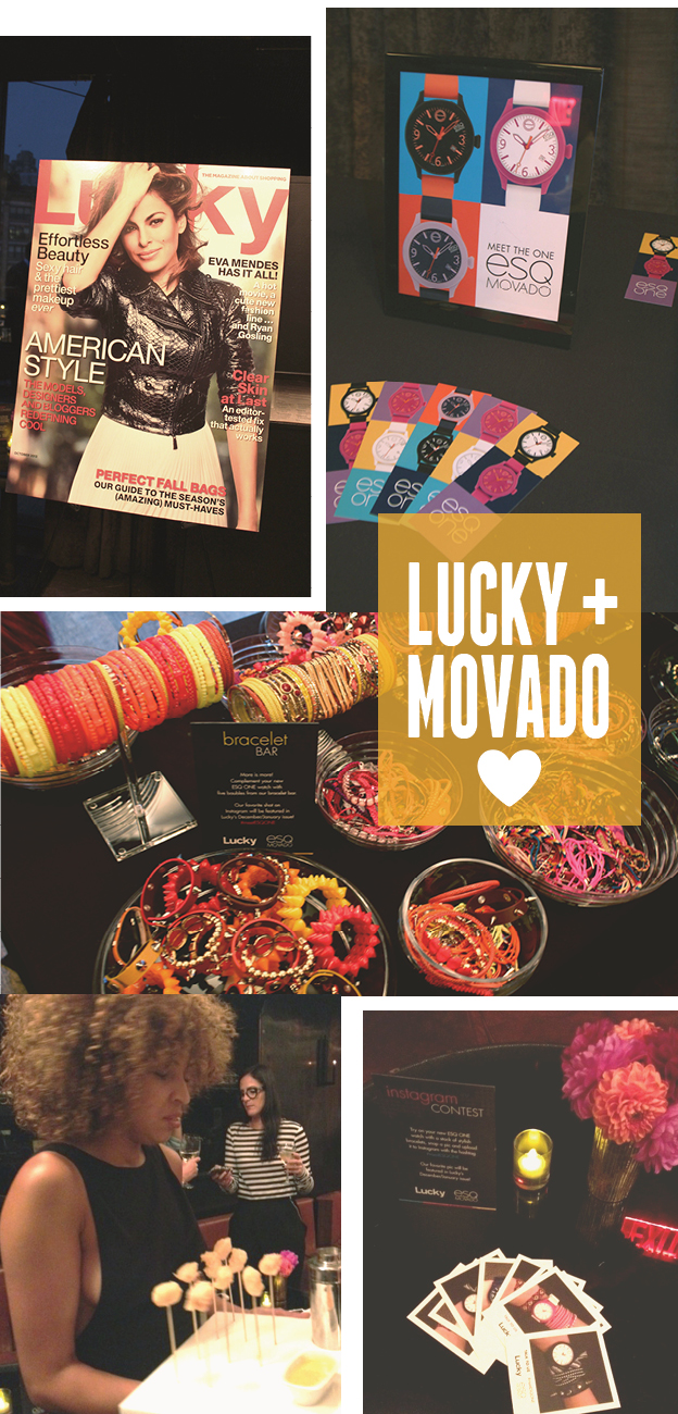 Tuesday night I had the honor of attending an event thrown by Lucky Magazine to unveil Movado’s new line of watches. It was held at Catch in New York’s meat packing district. I love the meat packing district and will jump at any chance to head to this chic and popular neighborhood. I attended the event with my fellow blogger and friend, Lola of Around the Girl in 80’s Ways.  We chatted with fellow bloggers as we’ll as the Lucky editors that were in attendance. Our invite included a free watch and five free bracelets! Wow. Was it our “Lucky” night or what! There were also cocktails, free flowing wine, hor dourves and a candy bar. I chose the all black watch with white numerals and Lola chose the two toned gray. Doesn’t it look great with the bracelets she chose? I also had the pleasure of running in to fellow blogger Adri of Adri’s World . We talked shop (we are both graphic designers) and enjoyed wine while  admiring our free booty. It was a super fun way to spend on Tuesday evening and I look forward to the next event. So stay tuned, I will bring it all to you my lovely readers.Â