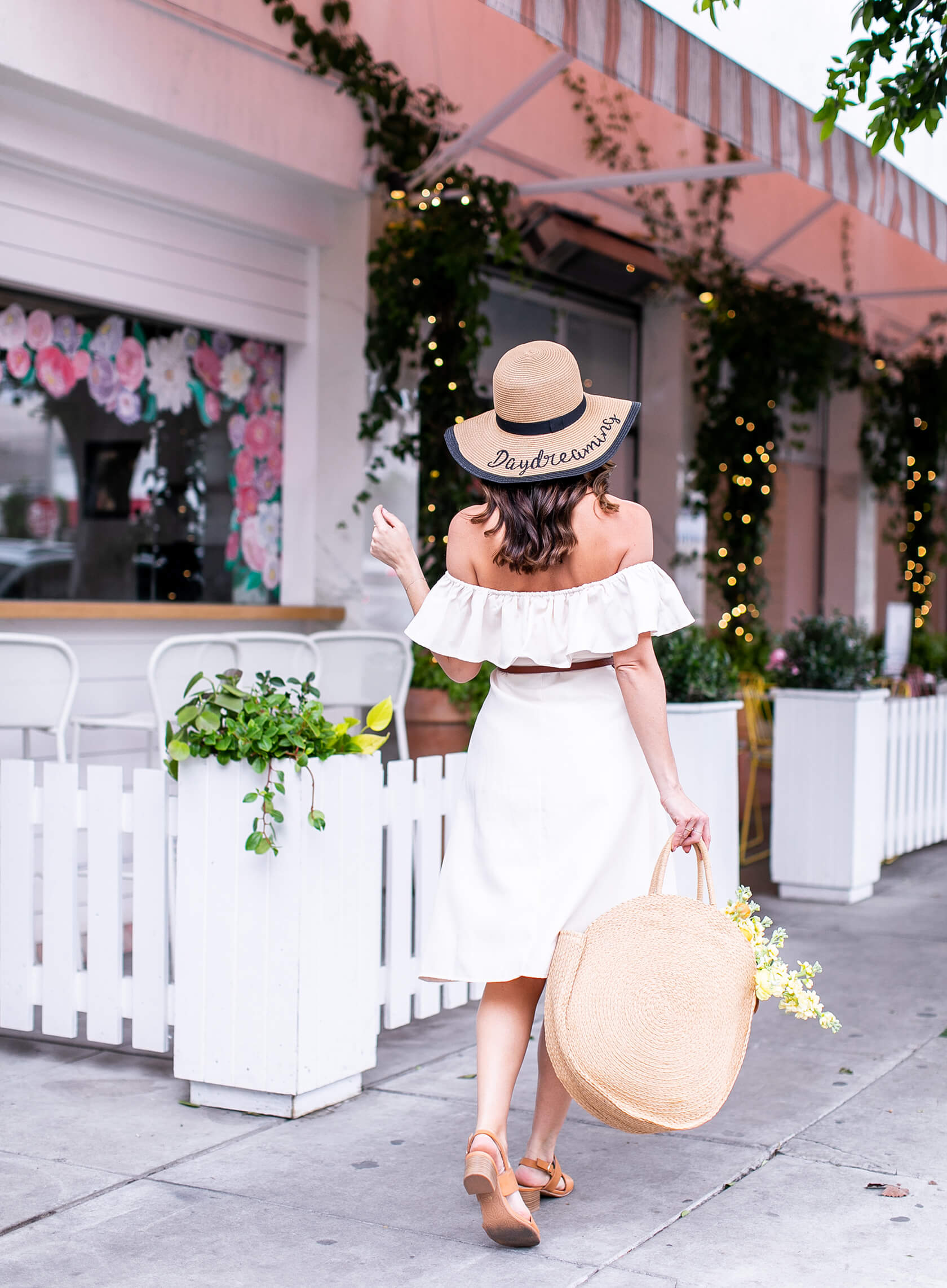 The straw hat along with the white dress mini looks rather luxurious 🙂 Such an easy look for Summer.